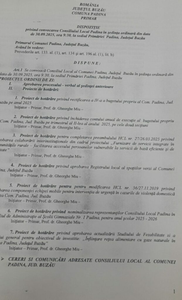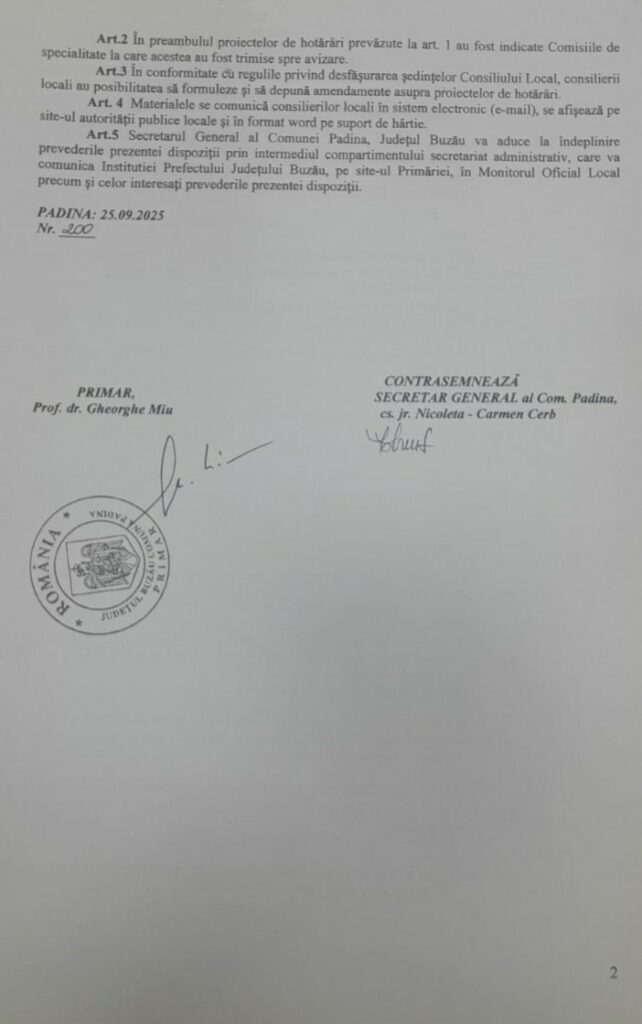 Art.1 Se convoacă Consiliul Local al Comunei Padina, Judeţul Buzău în şedinţa ordinară din data de 30.09.2025, ora 9:30, la sediul Primăriei Padina, Județul Buzău